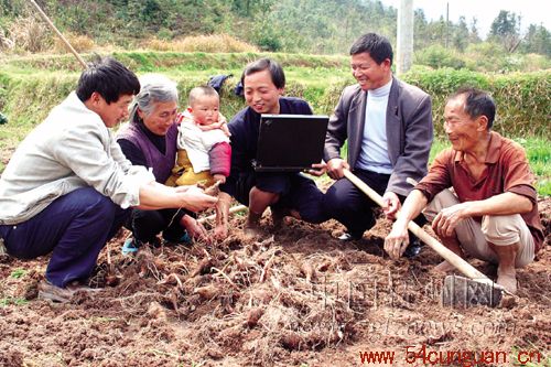 大学生村官罗建亮在田间上网发布当地特产花芋销售信息。 |