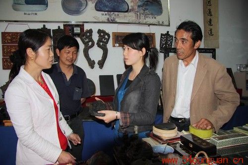 | 吴萍(右二)和村两委干部与文房四宝店女老板交流经营策略 |