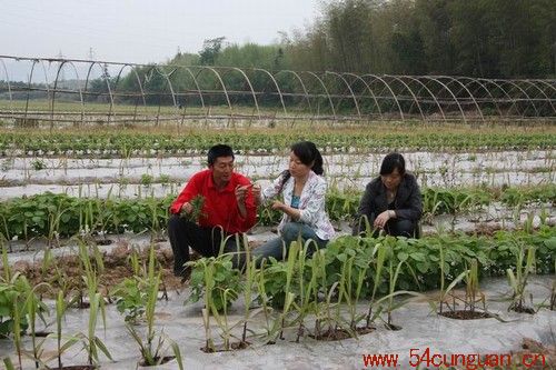 | 朱文艳(中)在指导种植柑庶大户对柑庶高产技术田间管理 |