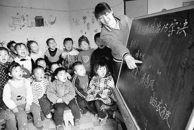 汤后湾张村大学生“村官”郑芳芳在该村幼儿园教小朋友预防手足口病“15字口诀”。 |