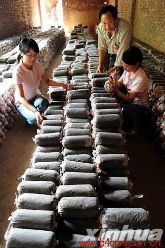 河南省嵩县何村乡的两名女“大学生村官”在技术人员的指导下管理生产黑木耳的菌袋。