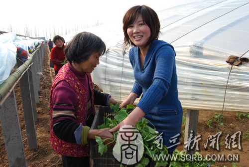 民权县积极发挥大学生“村官”的作用,鼓励他们带着群众干。图为该县孙六镇龙门寨村主任助理刘美华在蔬菜大棚旁移栽黄瓜苗。 崔本仓 张平摄