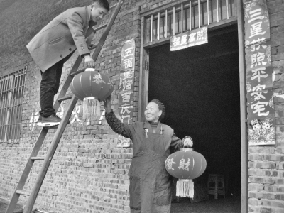 图为曾茂林(左)给老人贴春联挂灯笼。