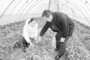 上图:樊盛林(左)在草莓棚内查看草莓生长情况。万建辉 摄