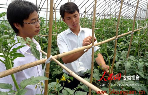 | 今年5月2日,在中央电视台新闻联播《安徽大学生村官:心向农村土地宽》中,曾经报道过的安徽省黄山市葛湖村村委会主任助理叶青与凤阳县大王府村的"村官"时全,在凤阳县大王府的大学生创业示范园,一起交流引导当地农民种植蔬菜大棚的经验与体会。 |