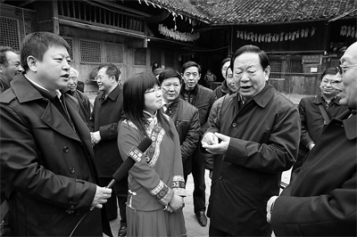 2011 年4 月, 中国扶贫开发协会会长胡富国(右二) 赴重庆调研贫困村大学生村官履职情况。