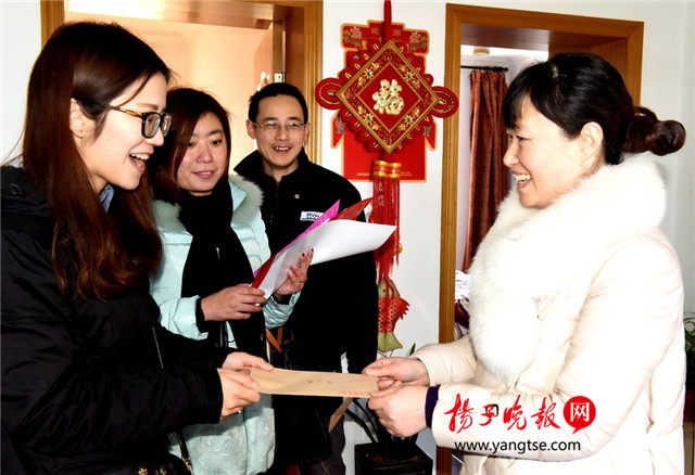辞别了史金慧家,付云和孙蓓蓓再度出发,这次的目标是桑园南村成军、张来萍夫妇家。穿过几道小巷,在一幢旧楼巷前,付云和孙蓓蓓晕了。“这户军属还真不熟,上次来是送参军喜报的,几个月一过,前后巷分不清了。”一脸愧疚的付云,很不好意思地对记者道:“不急,这里的居民,我们都很熟,我来问问前面那位大妈,你们等着,我就回来。”付云边说边走到后排过道站着一位大妈面前:“阿姨,请问今年刚当兵的成方晟父母住在那儿呀”、“你找军属家呀,他家在前面那幢楼的4楼,从前面那个巷道进去,西边第一个楼梯口上去就是”、“谢谢阿姨。”找到了准确位置,付云来到了成家。打扮新潮的女主人正准备外出,看到社区两位同志上门,立即喜上眉梢,微笑着把客人引入客厅。面对整洁的厅堂,付云要换鞋入室,男主人成军说:“没事,不用换鞋戴套,过会再拖一下就好了。”得知社区同志是来送双拥年画和慰问金,成军夫妇俩开心极了。付云说:“你们把惟一的儿子,送到部队,保家卫国,接受锻炼,社区应该为你们家庭做些力所能及的服务。”成军接话说,周末儿子打电话回来时,他们还在电话里教育他,要不怕苦不怕累,要听领导的话,为国家站好岗、放好哨,“我还告诉儿子,只有祖国这个大家安宁了,我们自己的小家才会幸福。”付云将仪征市人民政府专门为烈军属、转退军人印制的年画,交给女主人张来萍,女主人当场就将家中挂福字的地方让了出来,将展示我军丰采的宣传画,十分开心地张贴起来。